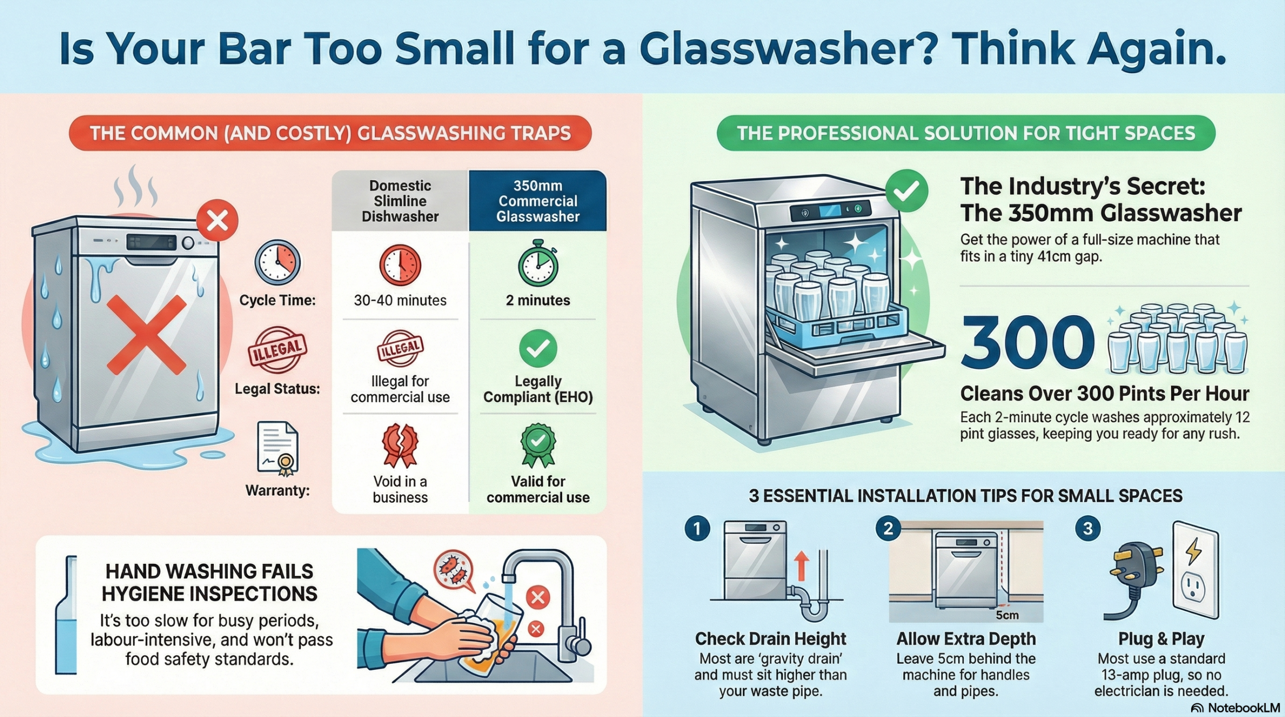- The Speed: A domestic rapid cycle is 30-40 minutes. A commercial 350mm cycle is 2 minutes. On a busy Friday, you cannot wait 30 minutes for 12 glasses.