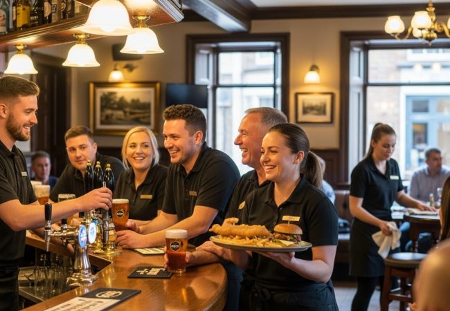 Smiling pub staff serving customers at a busy UK pub, showing teamwork and positive atmosphere. In the vibrant, fast-paced...