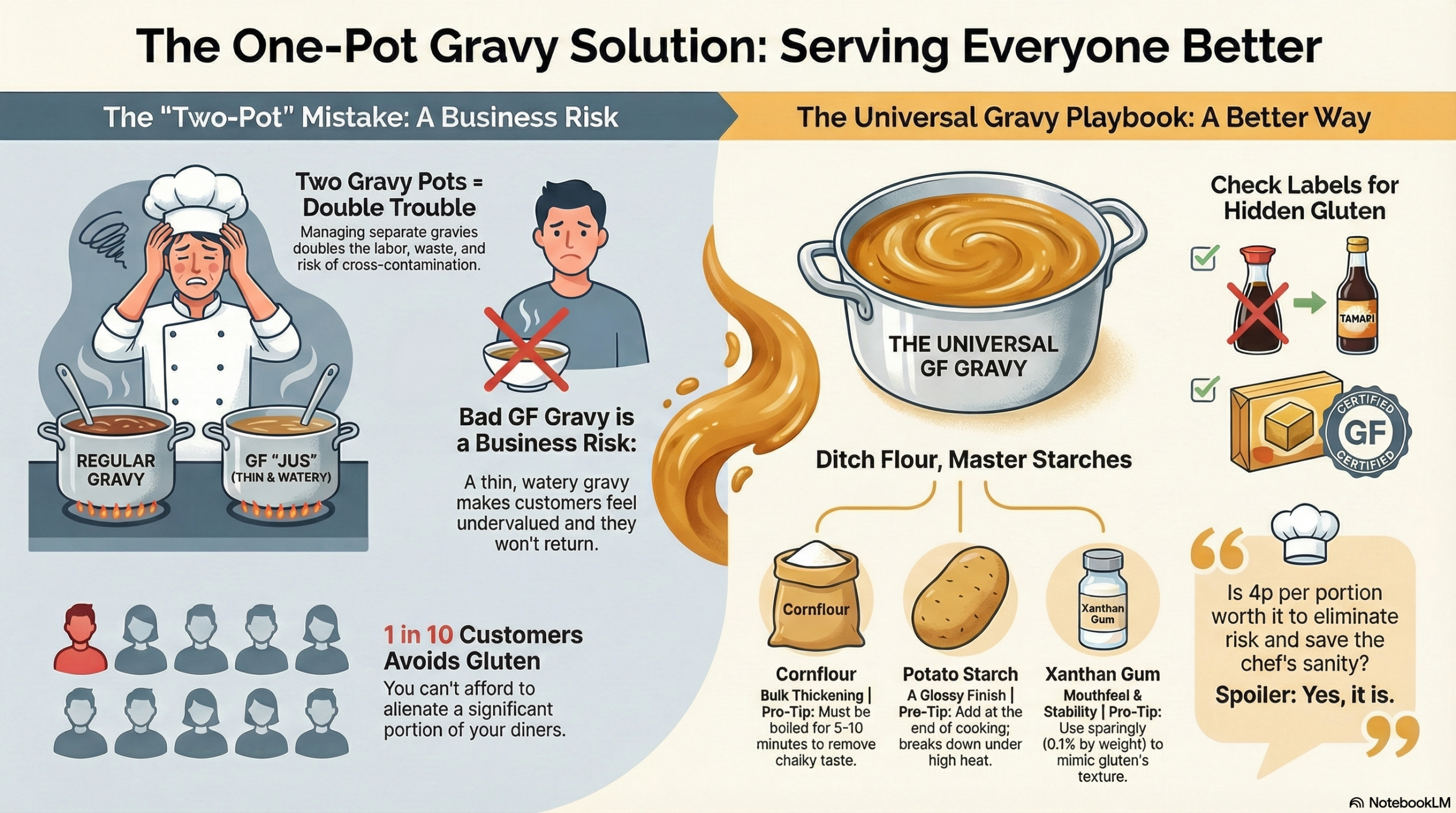 Stop treating GF gravy as an inconvenience. If you serve a Coeliac customer a watery jus, they won’t complain. They just won’t come back. Thicken it up. Check the labels. And simplify your life by making one amazing pot that everyone can eat.