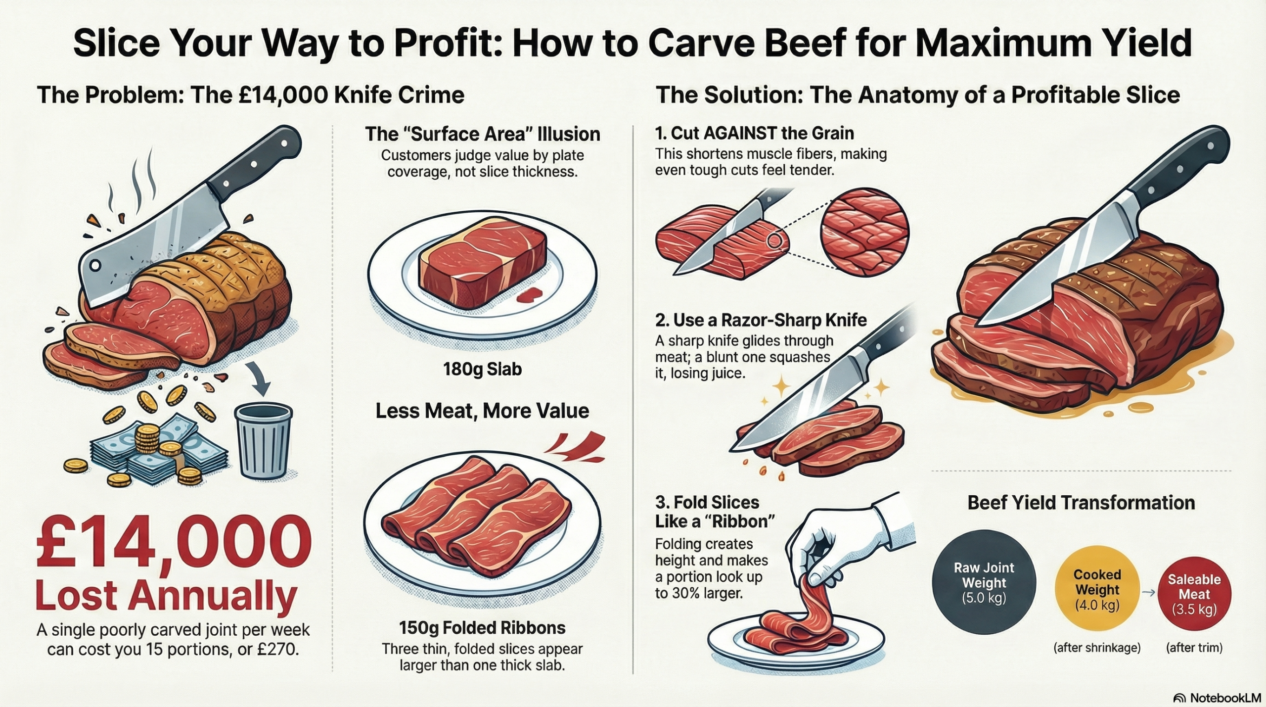 The knife is the steering wheel of your Sunday profit. Steer it carefully. Slice thin. Slice against the grain. And remember: You are selling the experience of a roast, not a brick of protein.