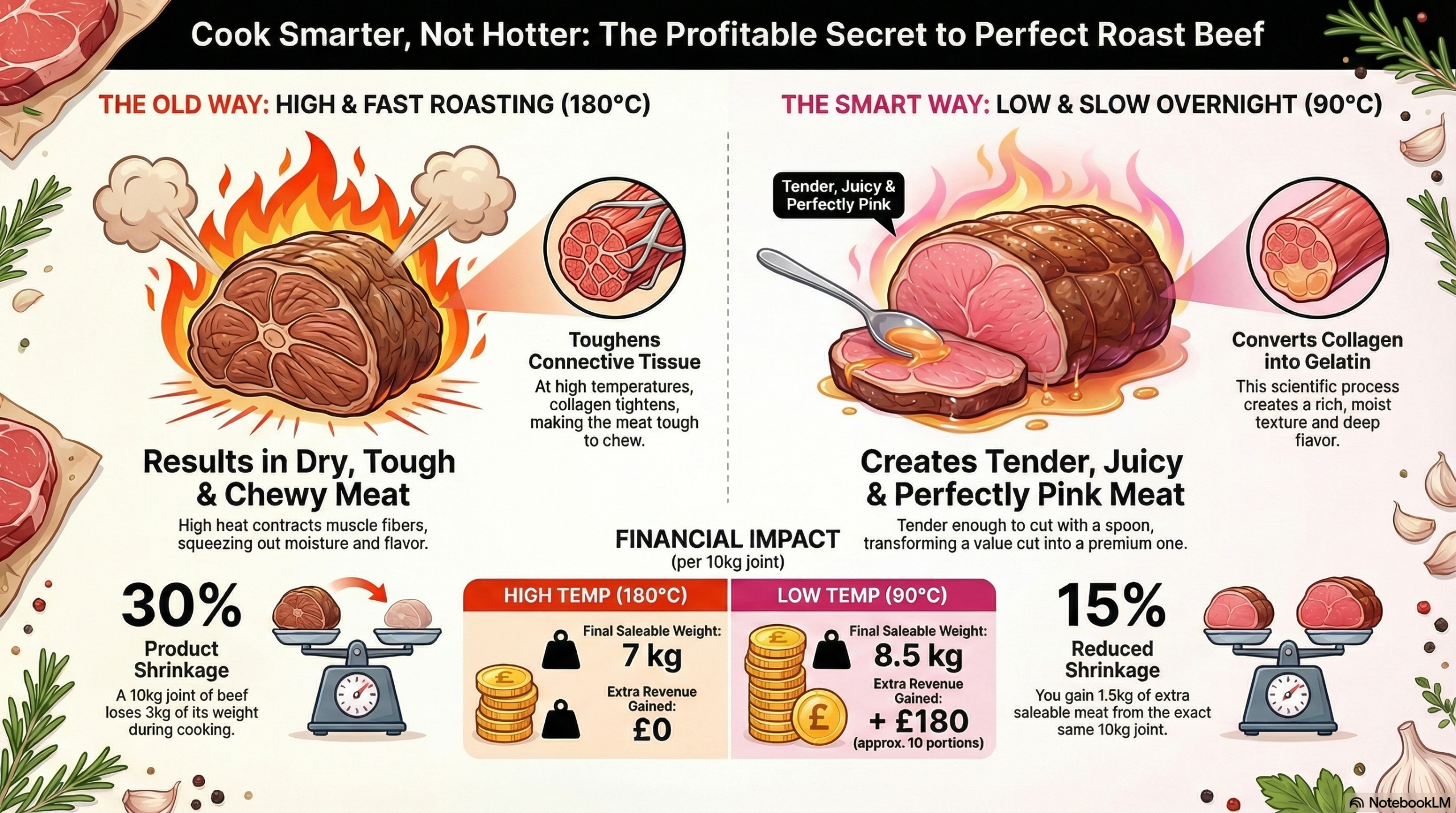 You gain 1.5kg of saleable beef just by changing the oven dial. That is roughly 10 extra portions. That is £180 extra revenue from the exact same joint.