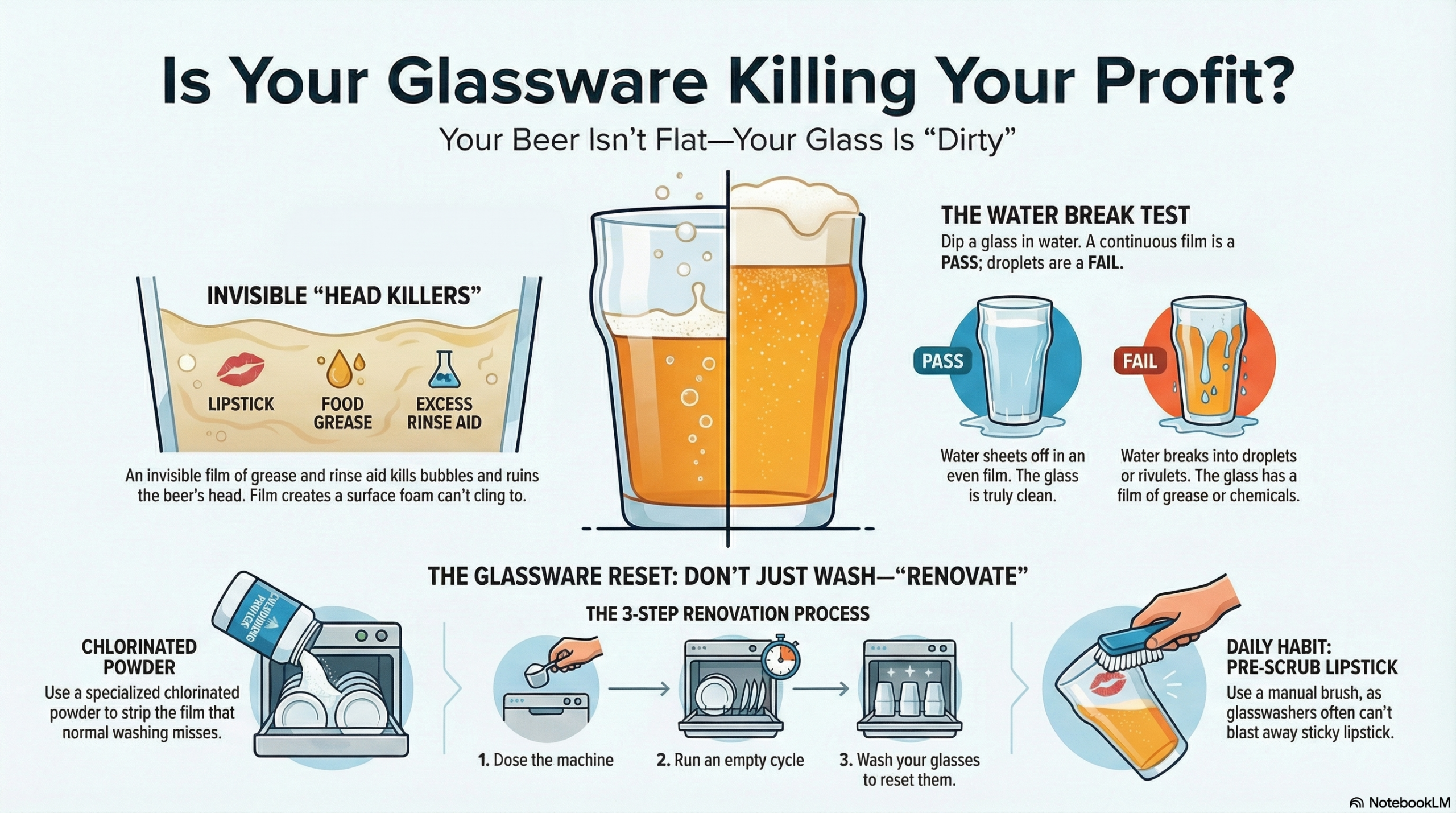 - Invisible Film: Fat and rinse aid cling to glass, killing bubbles instantly.
