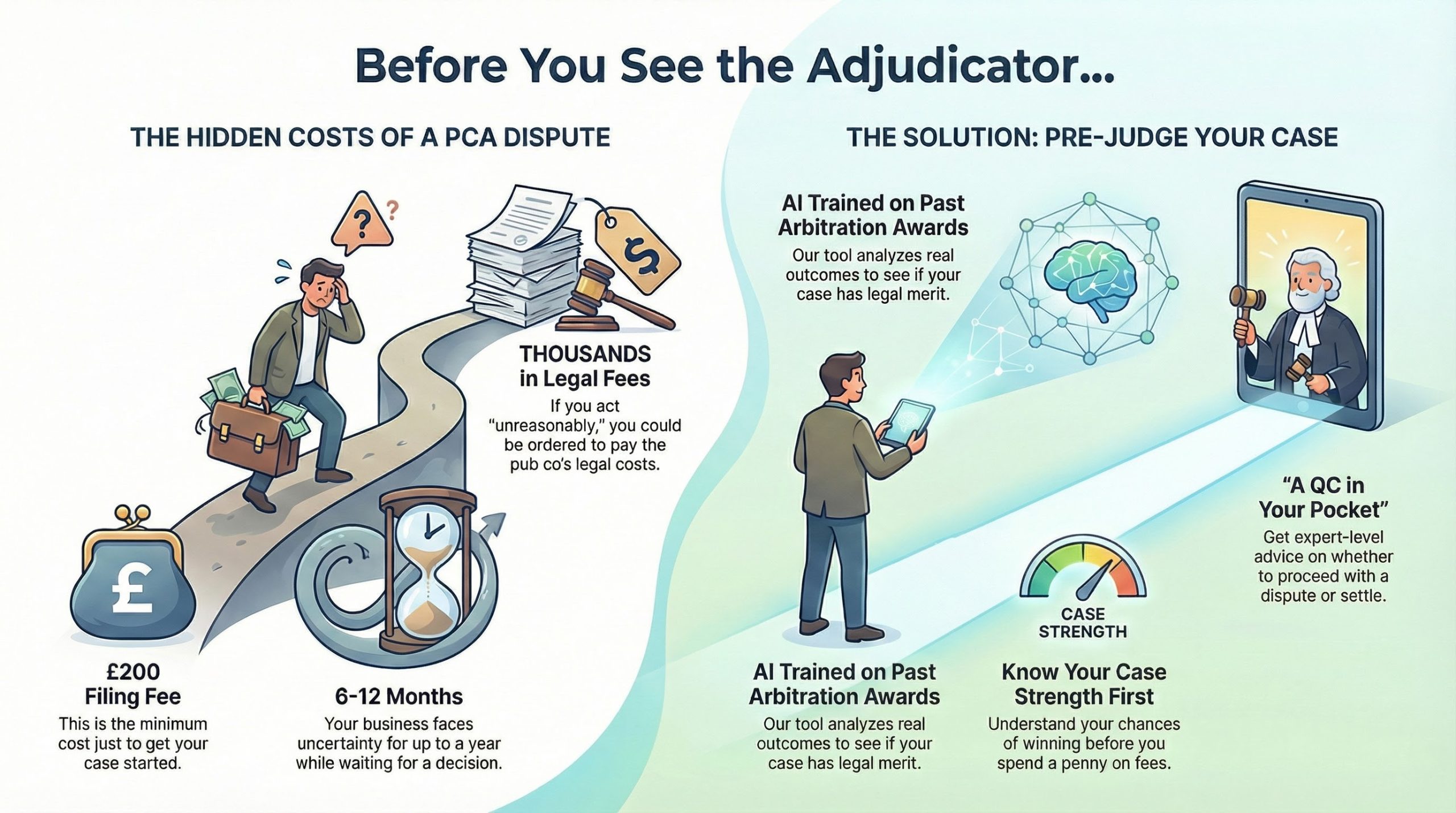 First, there is the £200 referral fee just to open a case. But that’s pocket change compared to the real risk. Arbitration is a formal legal process. The Pub Company will send a barrister. If you turn up with a shoebox of receipts and a “gut feeling,” you will get crushed.