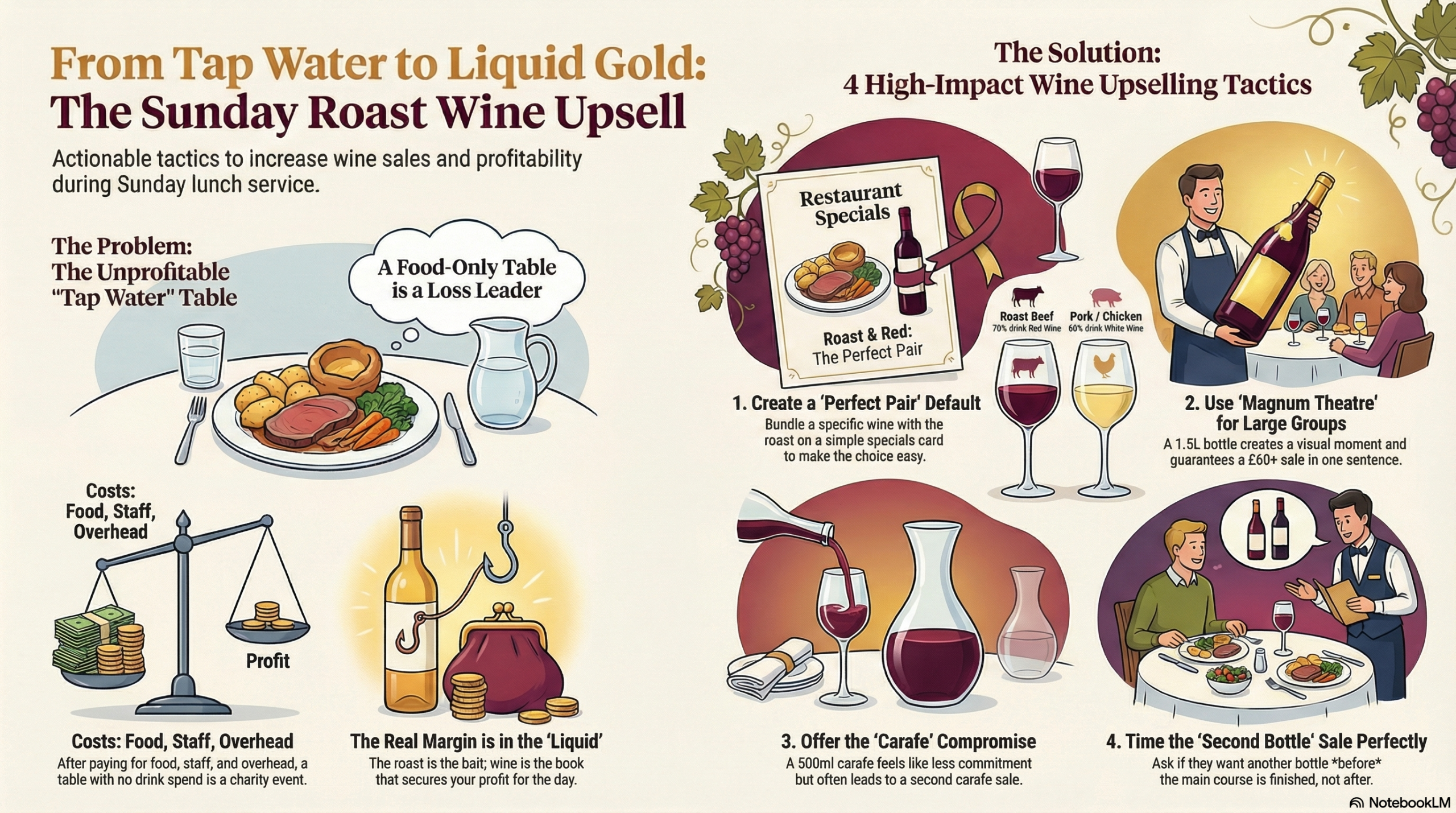 Your heart sinks. You are running that table at a loss. By the time you pay for the beef, the chef, the waitress, the laundry, and the heating, a food-only table with zero “wet” spend is basically a charity event. The margin in hospitality is in the liquid. The Roast is the bait; the Wine is the hook. If your staff are scared to sell wine, or if your menu doesn’t encourage it, you are leaving hundreds of pounds on the table every single Sunday.